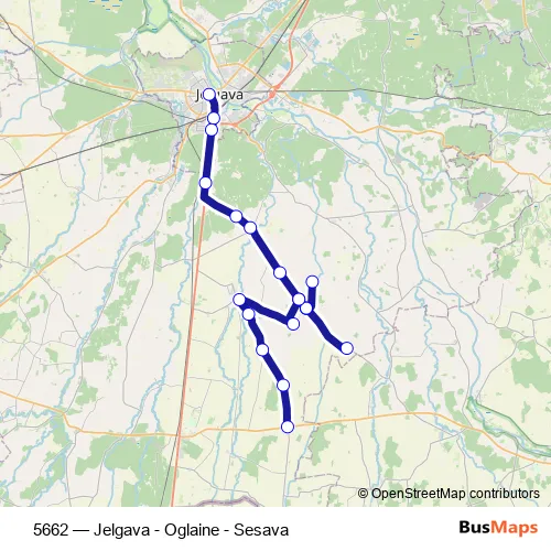 The first stop of the 5662 bus route is Jelgavas Ao and the last stop is Sesava. 5662 (Jelgava - Oglaine - Sesava) is operational during everyday.