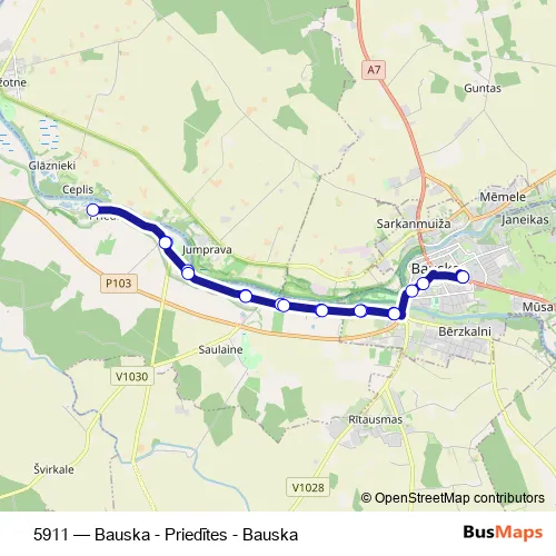 The first stop of the 5911 bus route is Bauskas Ao and the last stop is Bauskas Ao. 5911 (Bauska - Priedītes - Bauska) is operational during everyday.