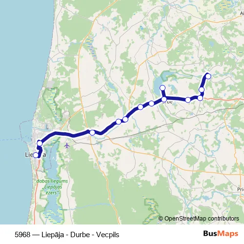 The first stop of the 5968 bus route is Vecpils and the last stop is Liepāja (Kuršu iela). 5968 (Liepāja - Durbe - Vecpils) is operational during on weekdays.