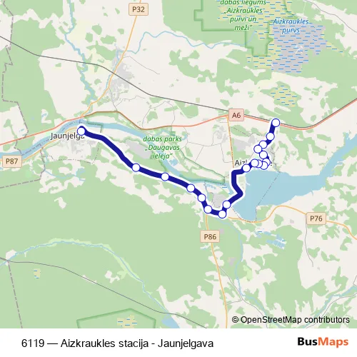 The first stop of the 6119 bus route is Aizkraukles stacija and the last stop is Jaunjelgava. 6119 (Aizkraukles stacija - Jaunjelgava) is operational during everyday.
