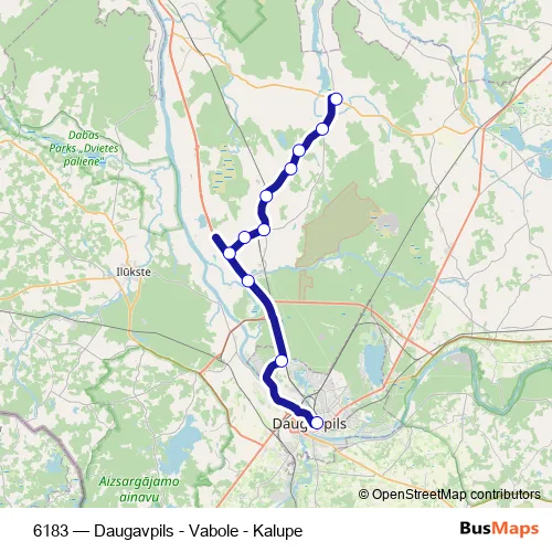 The first stop of the 6183 bus route is Kalupe and the last stop is Daugavpils Ao. 6183 (Daugavpils - Vabole - Kalupe) is operational during everyday.