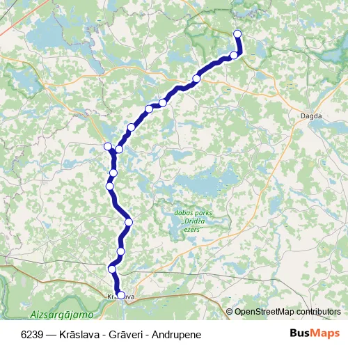 The first stop of the 6239 bus route is Andrupene and the last stop is Krāslavas Ao. 6239 (Krāslava - Grāveri - Andrupene) is operational during everyday.