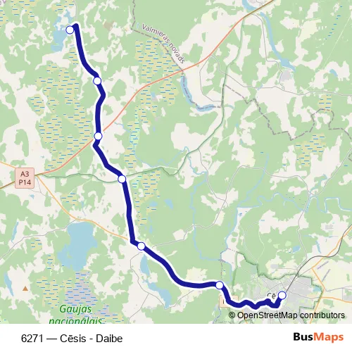 The first stop of the 6271 bus route is Daibe and the last stop is Cēsu Ao. 6271 (Cēsis - Daibe) is operational during everyday.