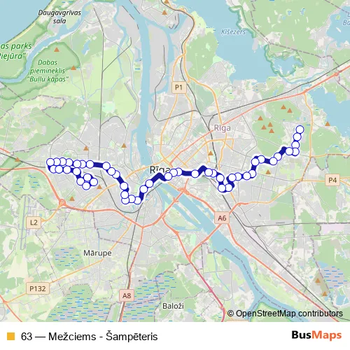 The first stop of the 63 bus route is Mežciems and the last stop is Šampēteris. 63 (Mežciems - Šampēteris) is operational during on weekdays.