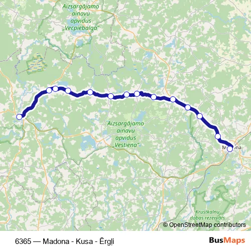 The first stop of the 6365 bus route is Ērgļi and the last stop is Madonas Ao. 6365 (Madona - Kusa - Ērgļi) is operational during everyday.