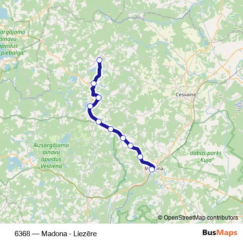 The first stop of the 6368 bus route is Madonas Ao and the last stop is Liezēre. 6368 (Madona - Liezēre) is operational during on weekdays.