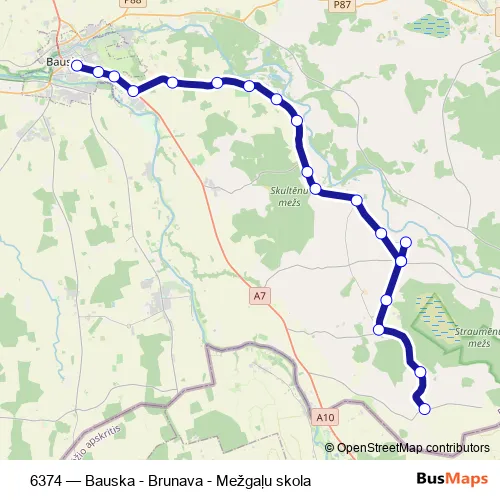 The first stop of the 6374 bus route is Tunkūni and the last stop is Bauskas Ao. 6374 (Bauska - Brunava - Mežgaļu skola) is operational during everyday.