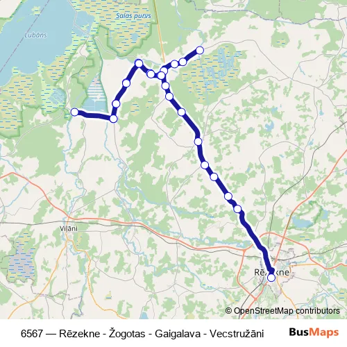 The first stop of the 6567 bus route is Vecstrūžāni and the last stop is Rēzeknes Ao. 6567 (Rēzekne - Žogotas - Gaigalava - Vecstružāni) is operational during everyday.