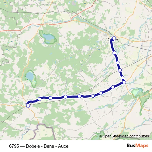 The first stop of the 6795 bus route is Auces stacija and the last stop is Dobeles Ao. 6795 (Dobele - Bēne - Auce) is operational during everyday.