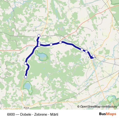 The first stop of the 6800 bus route is Mārti and the last stop is Dobeles Ao. 6800 (Dobele - Zebrene - Mārti) is operational during on weekdays.