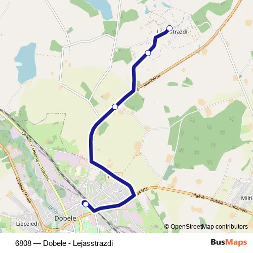 The first stop of the 6808 bus route is Lejasstrazdi and the last stop is Dobeles Ao. 6808 (Dobele - Lejasstrazdi) is operational during on weekdays.