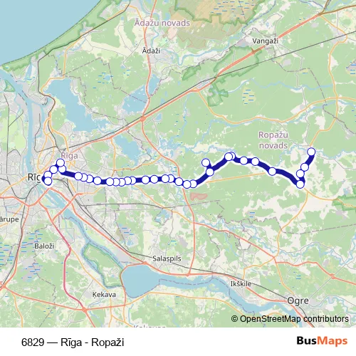 The first stop of the 6829 bus route is Ropaži and the last stop is Rīga (Riepnieku iela). 6829 (Rīga - Ropaži) is operational during everyday.