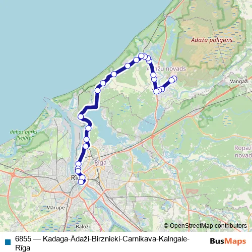The first stop of the 6855 bus route is Kadaga and the last stop is Rīga. 6855 (Kadaga-Ādaži-Birznieki-Carnikava-Kalngale-Rīga) is operational during on weekdays.
