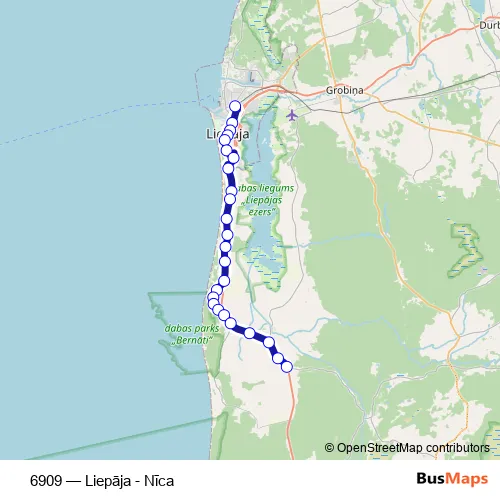 The first stop of the 6909 bus route is Liepājas Ao and the last stop is Nīca. 6909 (Liepāja - Nīca) is operational during everyday.