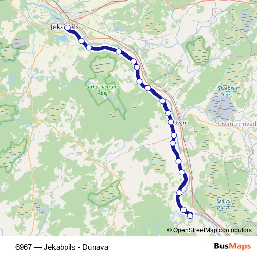The first stop of the 6967 bus route is Jēkabpils Ao and the last stop is Dunava. 6967 (Jēkabpils - Dunava) is operational during everyday.