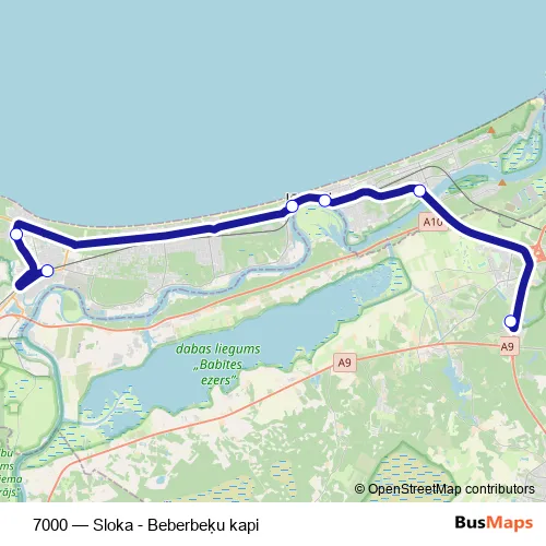 The first stop of the 7000 bus route is Sloka and the last stop is Beberbeķu kapi. 7000 (Sloka - Beberbeķu kapi) is operational during everyday.