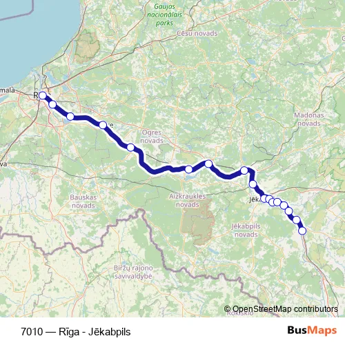 The first stop of the 7010 bus route is Rīgas Sao and the last stop is Jēkabpils Ao. 7010 (Rīga - Jēkabpils) is operational during everyday.