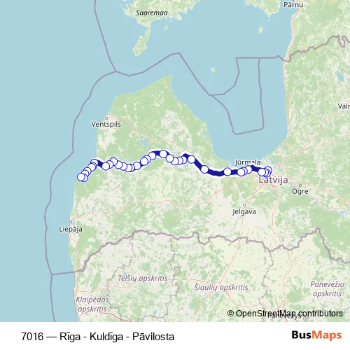 The first stop of the 7016 bus route is Rīgas Sao and the last stop is Pāvilosta. 7016 (Rīga - Kuldīga - Pāvilosta) is operational during everyday.