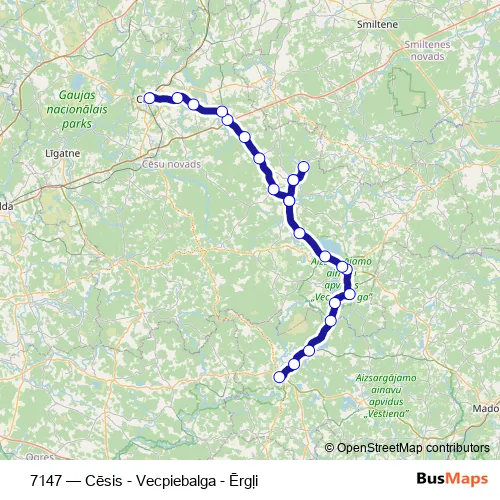 The first stop of the 7147 bus route is Ērgļi and the last stop is Cēsu Ao. 7147 (Cēsis - Vecpiebalga - Ērgļi) is operational during everyday.