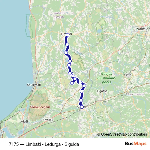 The first stop of the 7175 bus route is Siguldas Ao and the last stop is Limbažu Ao. 7175 (Limbaži - Lēdurga - Sigulda) is operational during everyday.