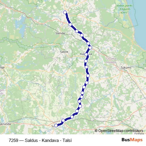 The first stop of the 7259 bus route is Talsu Ao and the last stop is Saldus Ao. 7259 (Saldus - Kandava - Talsi) is operational during everyday.