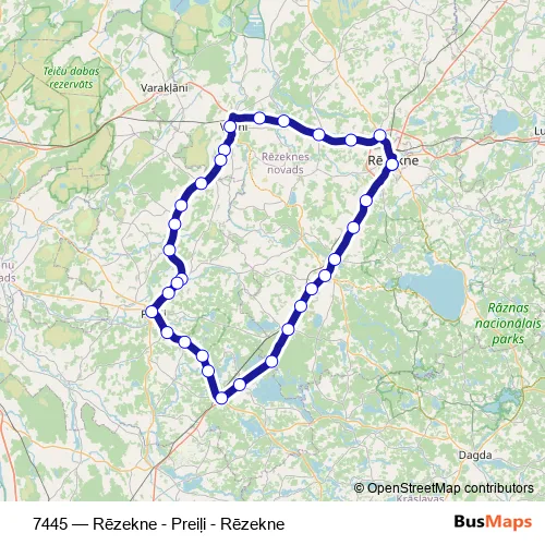The first stop of the 7445 bus route is Rēzeknes Ao and the last stop is Rēzeknes Ao. 7445 (Rēzekne - Preiļi - Rēzekne) is operational during everyday.