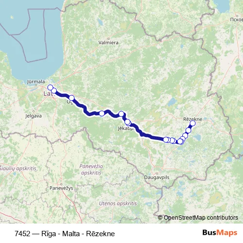 The first stop of the 7452 bus route is Rēzeknes Ao and the last stop is Rīgas Sao. 7452 (Rīga - Malta - Rēzekne) is operational during everyday.