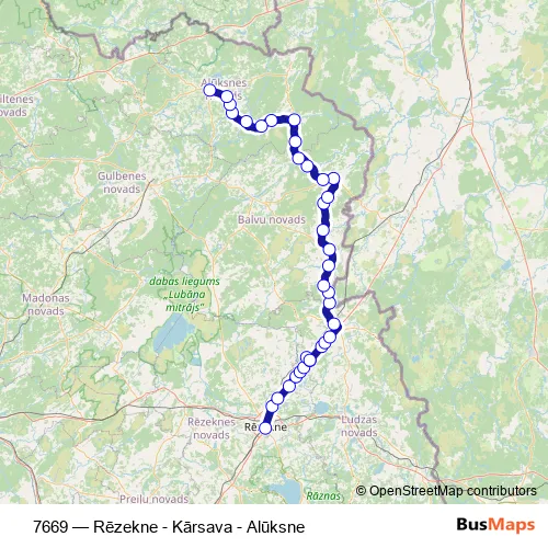 The first stop of the 7669 bus route is Rēzeknes Ao and the last stop is Alūksnes Ao. 7669 (Rēzekne - Kārsava - Alūksne) is operational during everyday.
