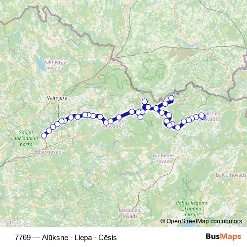 The first stop of the 7769 bus route is Alūksnes Ao and the last stop is Cēsu Ao. 7769 (Alūksne - Liepa - Cēsis) is operational during everyday.