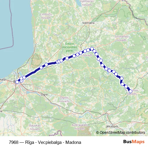The first stop of the 7968 bus route is Rīgas Sao and the last stop is Madonas Ao. 7968 (Rīga - Vecpiebalga - Madona) is operational during everyday.