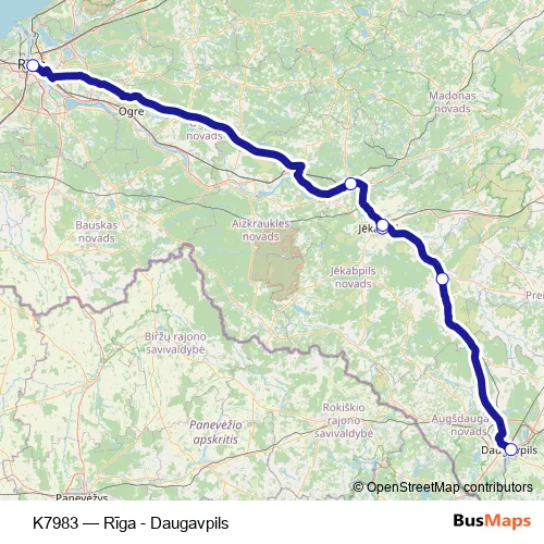 The first stop of the K7983 bus route is Daugavpils Ao and the last stop is Rīgas Sao. K7983 (Rīga - Daugavpils) is operational during everyday.