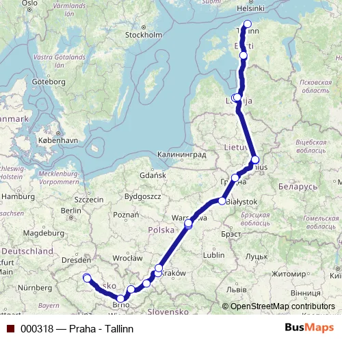 The first stop of the 000318 bus route is Praha (UAN Florenc) and the last stop is Tallinna bussijaam. 000318 (Praha - Tallinn) is operational during everyday.