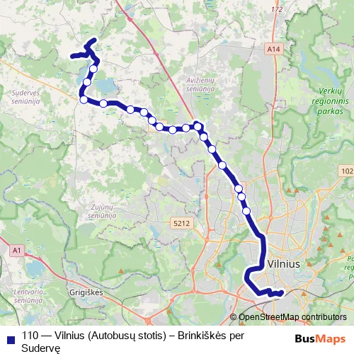 The first stop of the 110 bus route is Šeškinės poliklinika and the last stop is Užuežerė. 110 (Vilnius (Autobusų stotis) – Brinkiškės per Sudervę) is operational during on weekdays.
