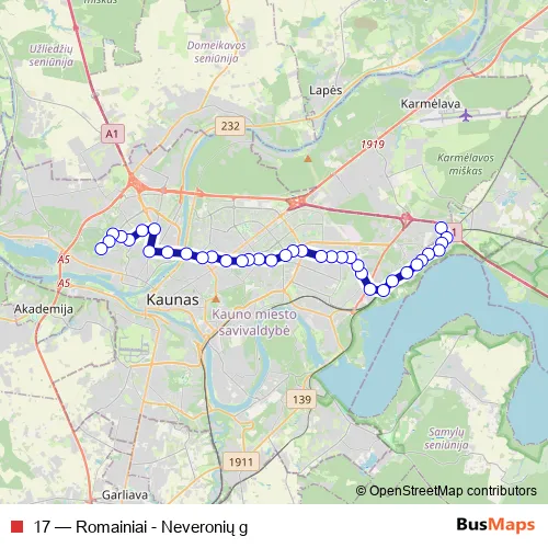 See why over 2 million users trust and consider busmaps.com as the best public transport website. busmaps gives you Kaunas Buses suggested routes, real-time bus tracker, line route maps in Kaunas, and helps to find the closest 17 bus stops near you. No internet available? Download an offline PDF map and bus schedule for the 17 bus to take on your trip.