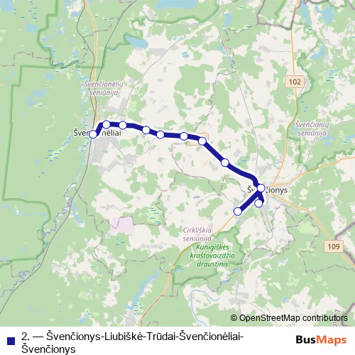 The first stop of the 2. bus route is Švenčionėliai and the last stop is Švenčionių autobusų stotis. 2. (Švenčionys-Liubiškė-Trūdai-Švenčionėliai-Švenčionys) is operational during on weekdays.