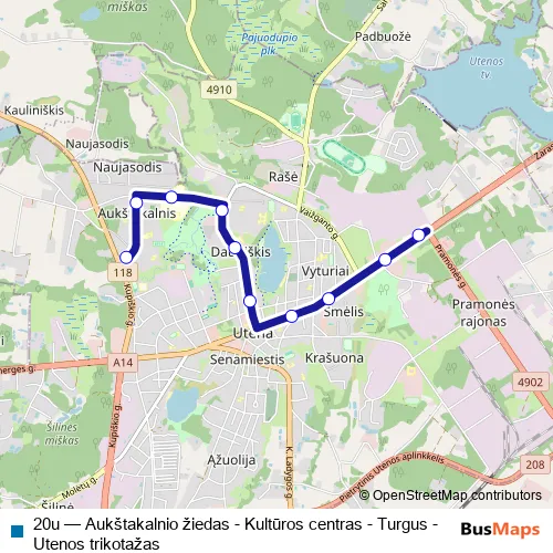 The first stop of the 20u bus route is Aukštakalnio žiedas and the last stop is Utenos trikotažas. 20u (Aukštakalnio žiedas - Kultūros centras - Turgus - Utenos trikotažas) is operational during everyday.