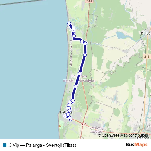 The first stop of the 3 Vlp bus route is Palanga As and the last stop is Tiltas. 3 Vlp (Palanga - Šventoji (Tiltas)) is operational during everyday.