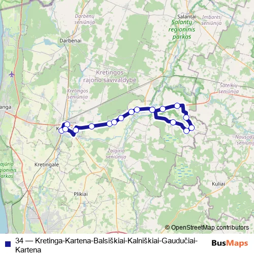 The first stop of the 34 bus route is Kretingos autobusų stotis and the last stop is Kartena. 34 (Kretinga-Kartena-Balsiškiai-Kalniškiai-Gaudučiai-Kartena) is operational during everyday.