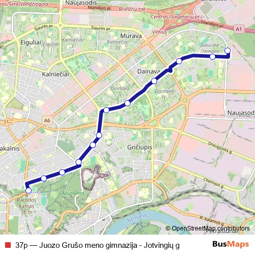 The first stop of the 37p bus route is Sporto g. B and the last stop is Partizanų g. A. 37p (Juozo Grušo meno gimnazija - Jotvingių g) is operational during on weekends.