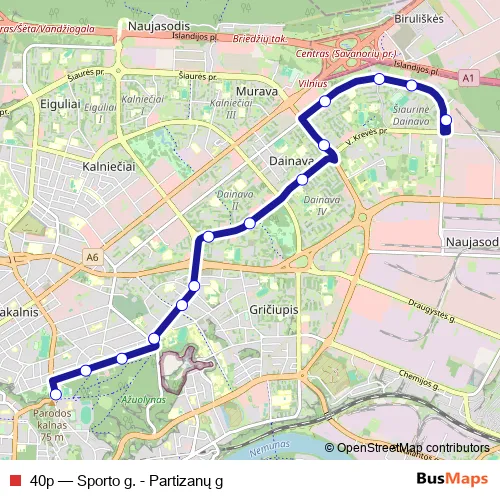 The first stop of the 40p bus route is Sporto g. B and the last stop is Partizanų g. A. 40p (Sporto g. - Partizanų g) is operational during on weekends.