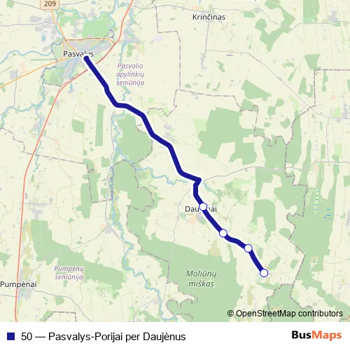 The first stop of the 50 bus route is Daujėnai and the last stop is Porijai. 50 (Pasvalys-Porijai per Daujėnus) is operational during everyday.