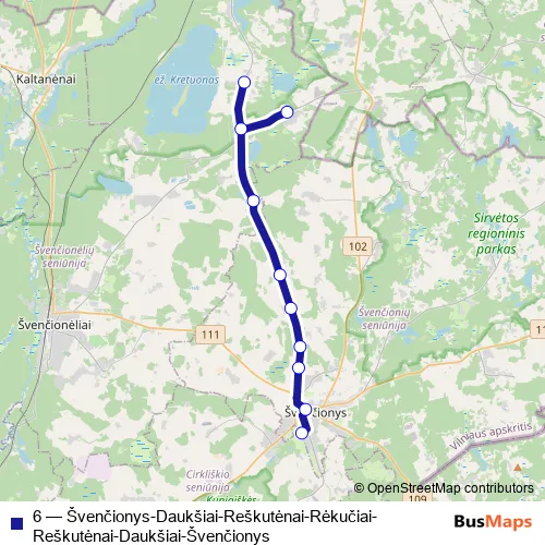 The first stop of the 6 bus route is Reškutėnai and the last stop is Švenčionių autobusų stotis. 6 (Švenčionys-Daukšiai-Reškutėnai-Rėkučiai-Reškutėnai-Daukšiai-Švenčionys) is operational during on weekdays.
