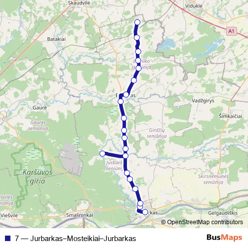 The first stop of the 7 bus route is Jurbarko autobusų stotis and the last stop is Mosteikiai. 7 (Jurbarkas–Mosteikiai–Jurbarkas) is operational during on weekdays.