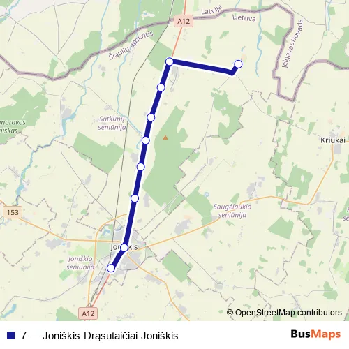 The first stop of the 7 bus route is Joniškio autobusų stotis and the last stop is Drąsutaičiai. 7 (Joniškis-Drąsutaičiai-Joniškis) is operational during on weekdays.