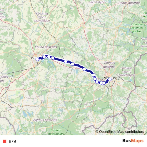 The first stop of the 879 rail route is Vilnius and the last stop is Kaunas. 879 is operational during everyday.