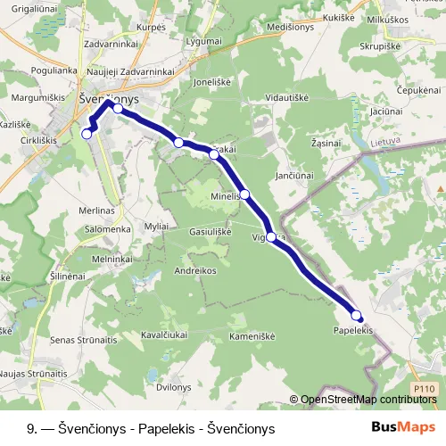 The first stop of the 9. bus route is Švenčionių autobusų stotis and the last stop is Jančiūnai. 9. (Švenčionys - Papelekis - Švenčionys) is operational during on weekdays.