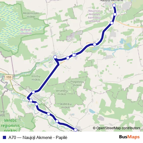 The first stop of the A70 bus route is Naujosios Akmenės autobusų stotis and the last stop is Papilė. A70 (Naujoji Akmenė - Papilė) is operational during on weekdays.