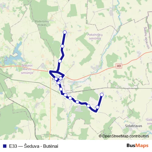 The first stop of the E33 bus route is Šeduva and the last stop is Vaižgai. E33 (Šeduva - Butėnai) is operational during on weekdays.