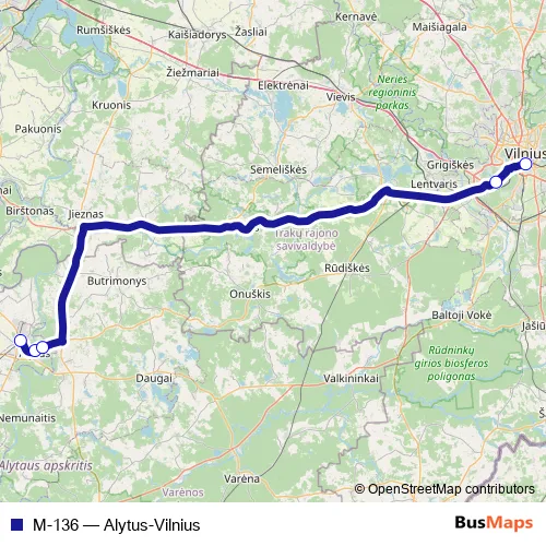 The first stop of the M-136 bus route is Alytaus autobusų stotis and the last stop is Vilniaus autobusų stotis. M-136 (Alytus-Vilnius) is operational during everyday.