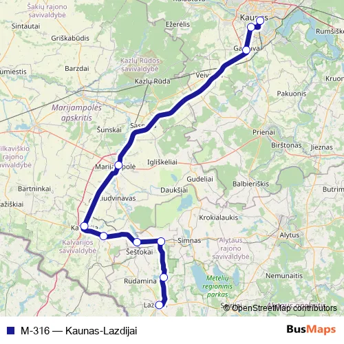 The first stop of the M-316 bus route is Lazdijų autobusų stotis and the last stop is Kauno autobusų stotis. M-316 (Kaunas-Lazdijai) is operational during everyday.